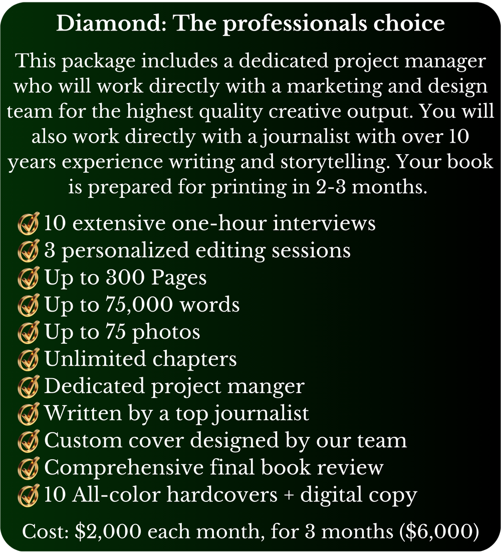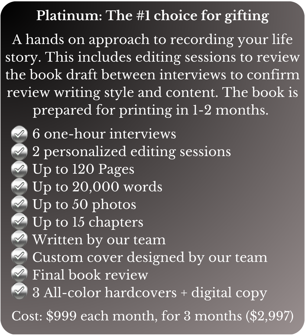 Our easy-to-use platform has empowered many to write their own stories with our Legacy Book. However, we understand that not everyone considers themselves a great writer, and the thought of writing a book of your life can be intimidating.