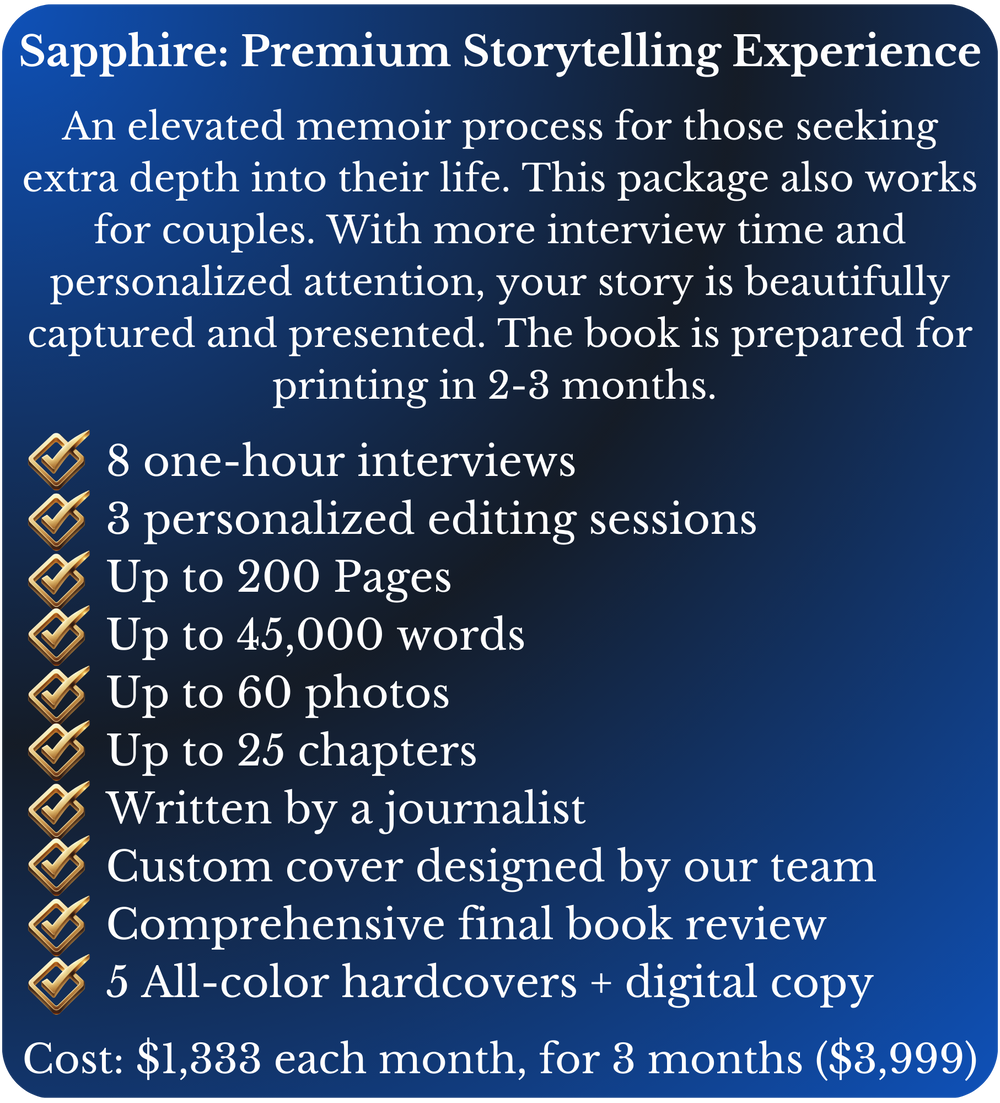 If a full biography with personal interviews and hands-on support feels like too much of a financial commitment right now, you still have options. Our self-service Legacy Book is a more affordable way to tell your story and create a book of your life, all at a lower price point.