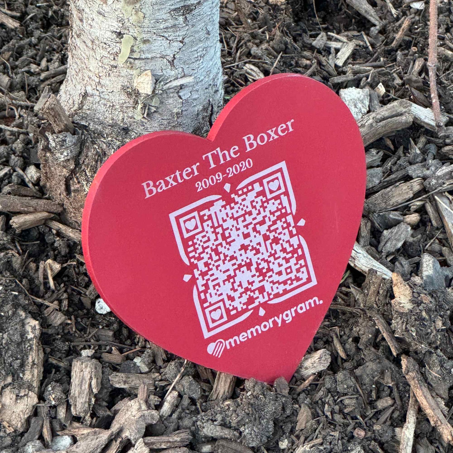 A weather-proof, 4 inch by 4 inch, aluminum heart engraved with your loved one's name, birth year, year of passing and a unique QR code.