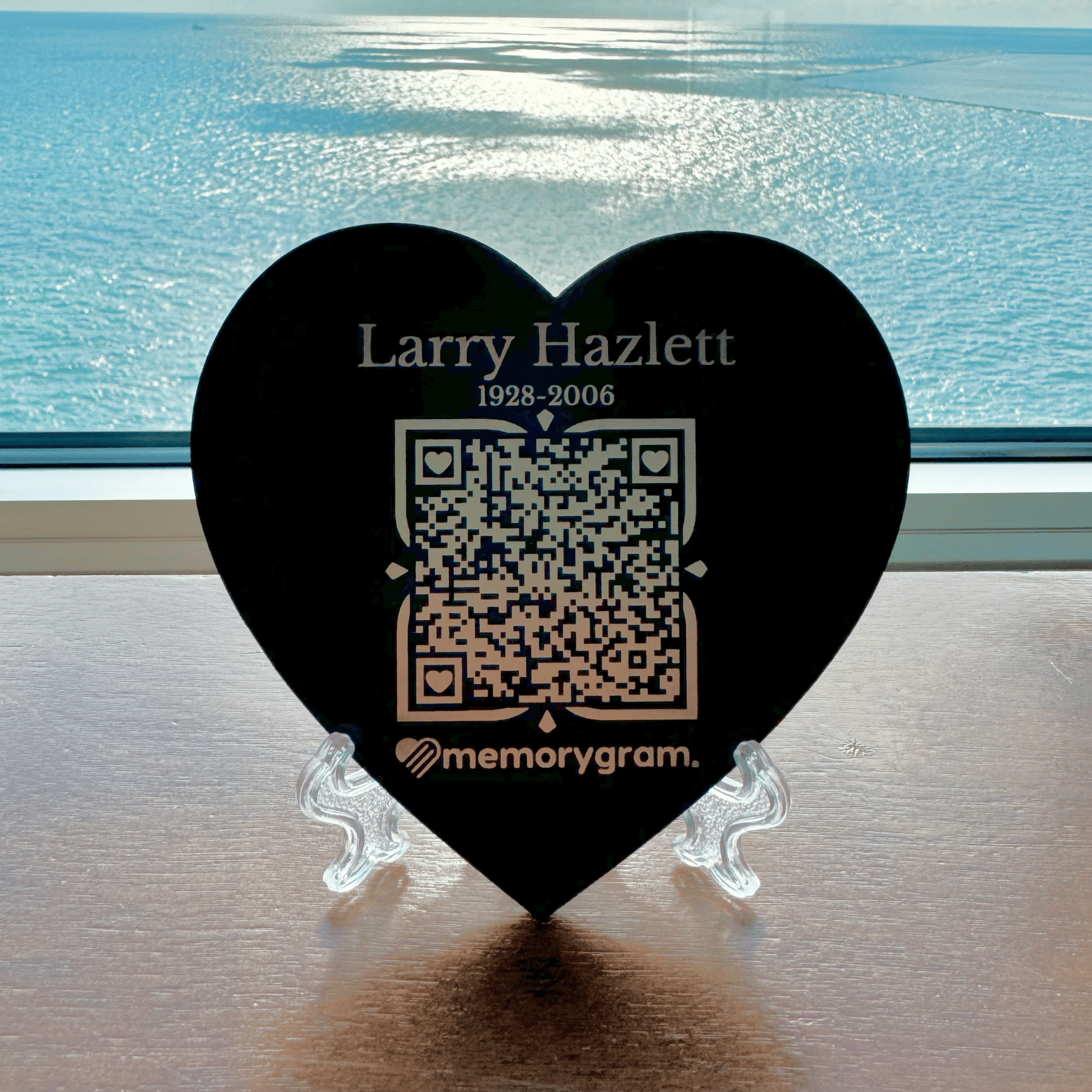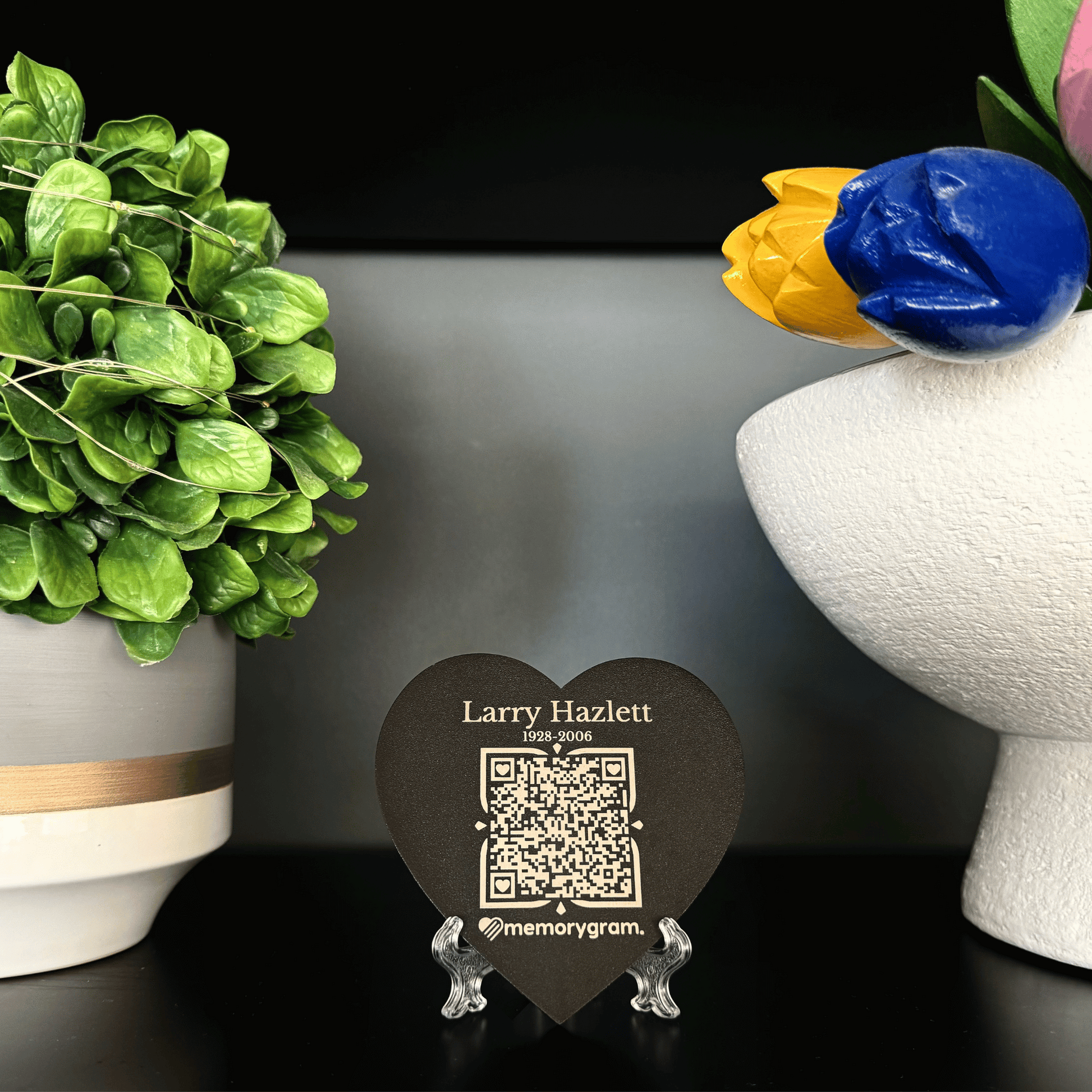 Each product features a unique engraved QR code that opens a personalized Virtual Memorial Page, where families can share photos, videos, tributes, and even have a conversation with their voice.